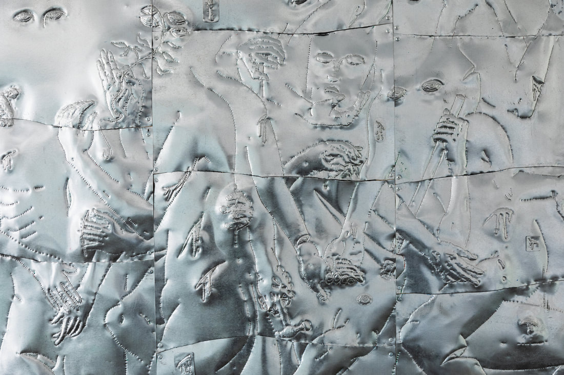 The imagery depicted across the metal surfaces includes workplace injuries and physical maladies, alongside mundane yet valued objects. Together, these symbols create a tension between harm and care, vulnerability and resilience. Installed through hanging, the votives form a collective presence within the window space, evoking both devotional offerings and industrial remnants.