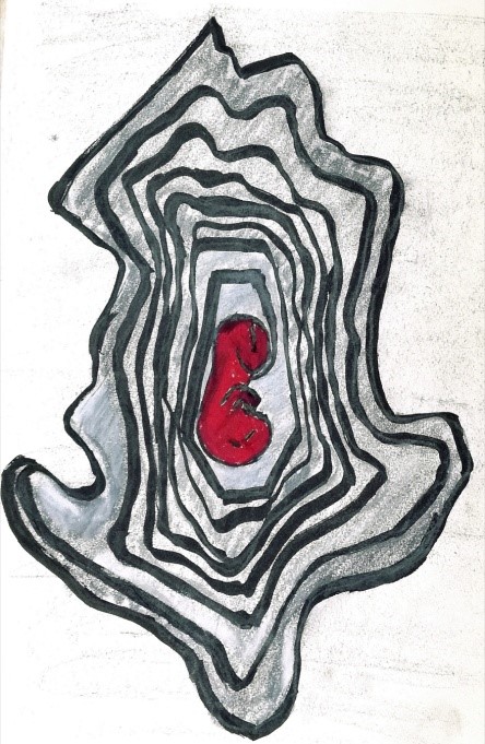 The previous text, as a sort of press release, was distributed to the public during “La Vie de Bohème & Dramaturgy of Boulevardisation”, an auto-bio-geo-graphic art performance, for which I got the support, through an artist grant, of the City of Espoo. During September 2021 in Helsinki’s Boulevardi (Pohjoisesplanadi & Eteläesplanadi), with makeup as Pinocchio-Parisian-Bohemian-Painter, I drew on a black background an iconic stylized red human fetus entrapped by a white line. A red line wrapped by the white one, as an umbilical cord circulate the fetus for several times, taking, by growing gradually, the shape firstly of a coffin and consequently of Albania’s geopolitical map/uterus. Then, in a second drawing, the process is reversed. Starting from drawing the map, this time of Finland, the red line wrapped by the white line shrinking in a spiral, penetrate a white coffin that entraps the above-mentioned fetus.